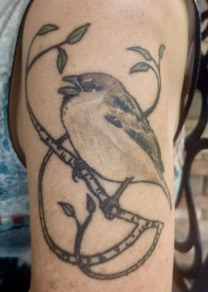 It had been quite a few years since my first tattoo, and I was ready for a second piece of artwork to wear on my body, now that I was entering a new phase of life. I chose an image of a sparrow, what I consider an “ordinary bird,” a totem animal I can relate to. I see myself as one of many “ordinary birds,” not particularly remarkable or brilliant, not wanting to call too much attention to myself, just going about my work, singing my little melody in a backyard. A small part of something much larger: the grand conversation going on between writers and readers over time, the flock of all creative humans, the interdependent ecosystem I belong to.